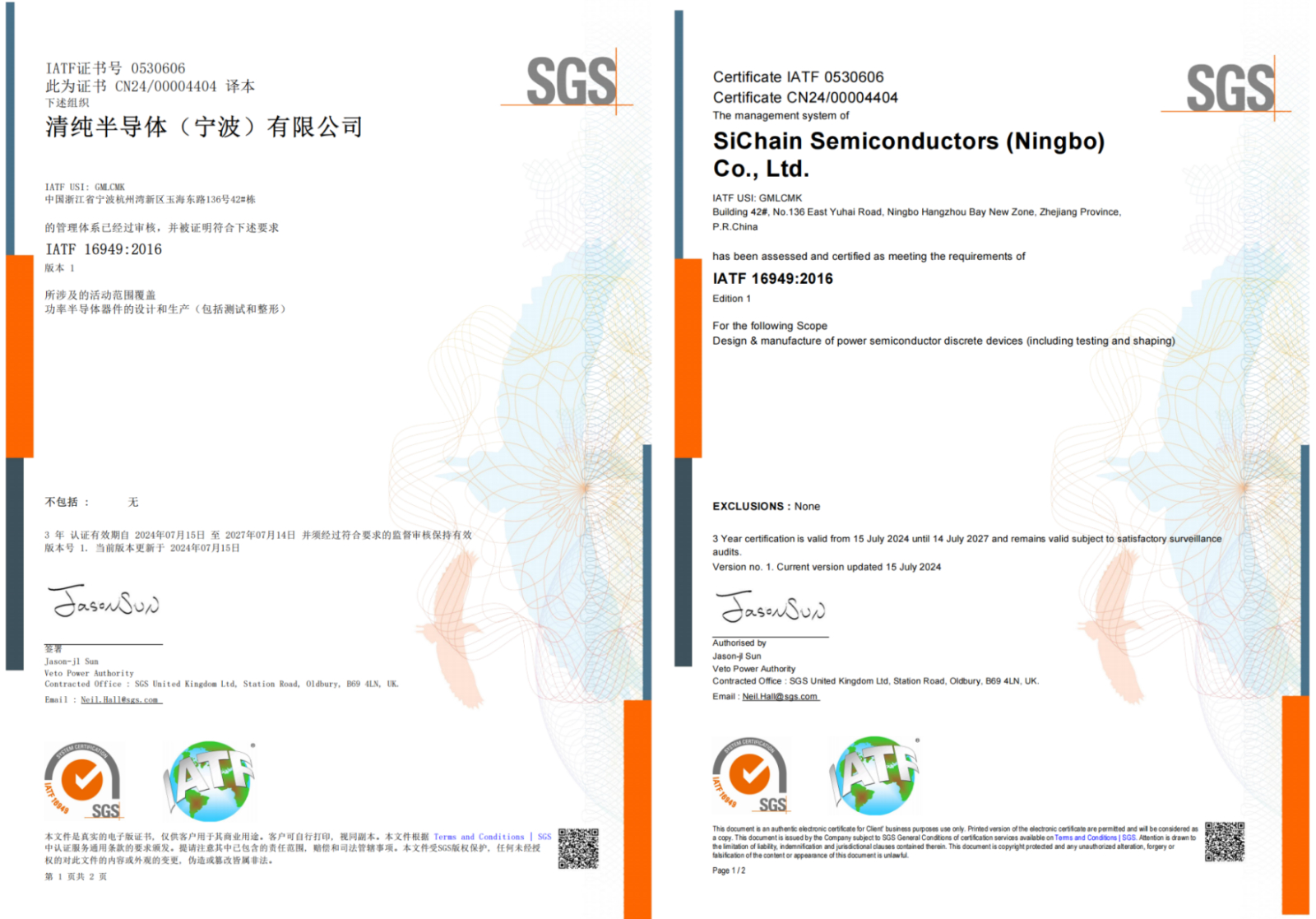 Recently, the company has officially obtained the IATF16949 automotive quality management system certification through strict auditing by the authoritative certification body SGS.This marks that SiChain's quality management system fully complies with international automotive industry quality management standards, providing a solid guarantee for the company to continue and steadily produce high-quality automotive grade products in the future, and providing a strong guarantee for the company to better serve automotive customers.