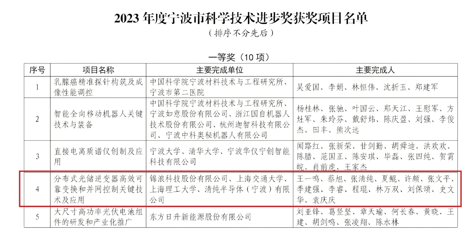 Recently, the Science and Technology Bureau of Ningbo City announced the list of winners for the 2023 Ningbo Science and Technology Progress Award. The "Key Technology and Application Project for Efficient and Reliable Conversion and Grid Control of Distributed Optical Storage Inverters" jointly submitted by Jinlang Technology Co., Ltd. and SiChain won the first prize of the 2023 Ningbo Science and Technology Progress Award, which is one of the highest level awards in the field of science and technology in Ningbo.